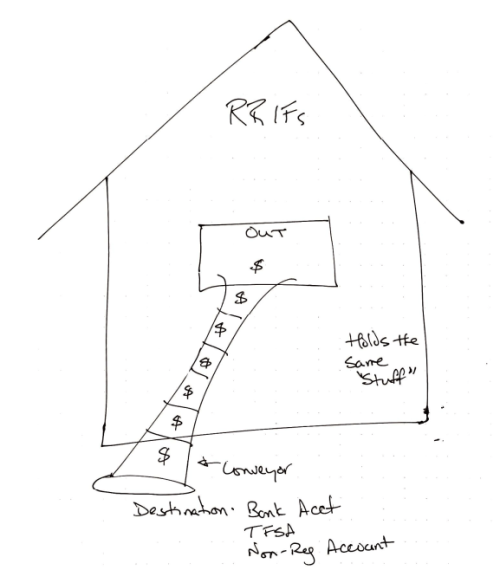 So, before the end of the year, you have to build a RRIF shed, right beside the RRSP shed. Using a not-so-secret underground tunnel (CRA knows all about it.), you move the “stuff” from the RRSP shed to the new RRIF shed. Voila. Done. That simple.